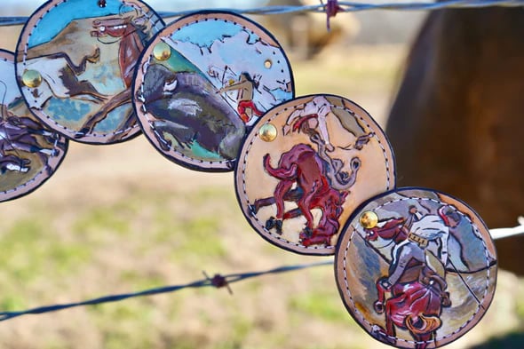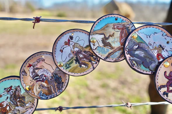 Illustrated round panels create a unique, eye-catching look with a vintage Western aesthetic.